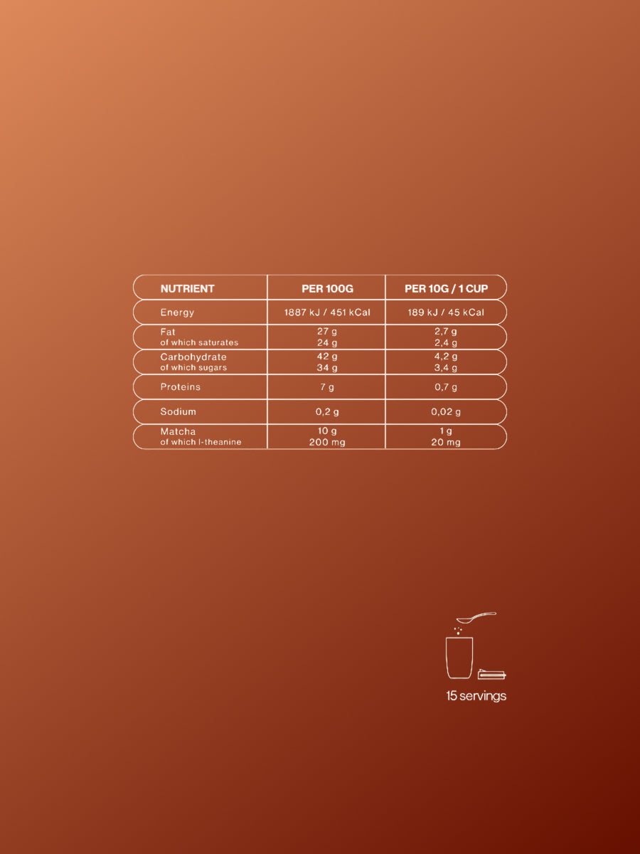 Pajuskite jaukumo akimirkas kiekviename gurkšnyje su mūsų riboto leidimo moliūgų prieskonių „Matcha Latte“. Leiskite kiekvienam puodeliui apglėbti Jus lyg mėgstamiausias megztinis, primenantis mėgstamiausių rudens moliūgų prieskonių desertų skonį.