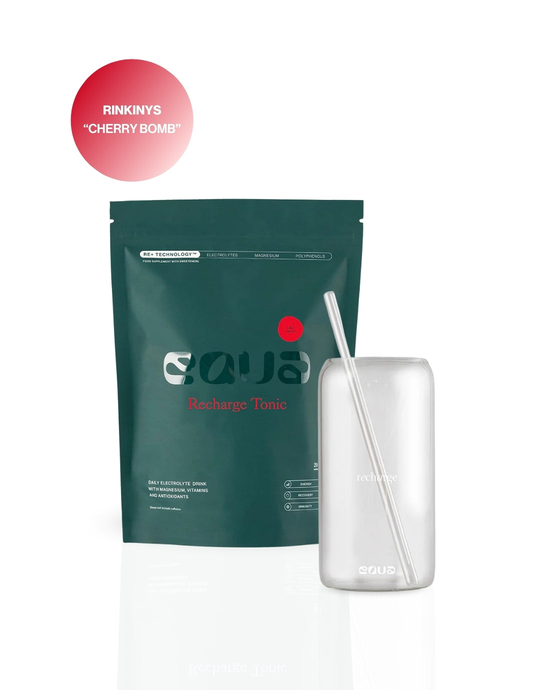 Rinkinį sudaro: 1 x Vyšnių skonio elektrolitų gėrimas ir 1 x Stiklinė Recharge + šiaudelis