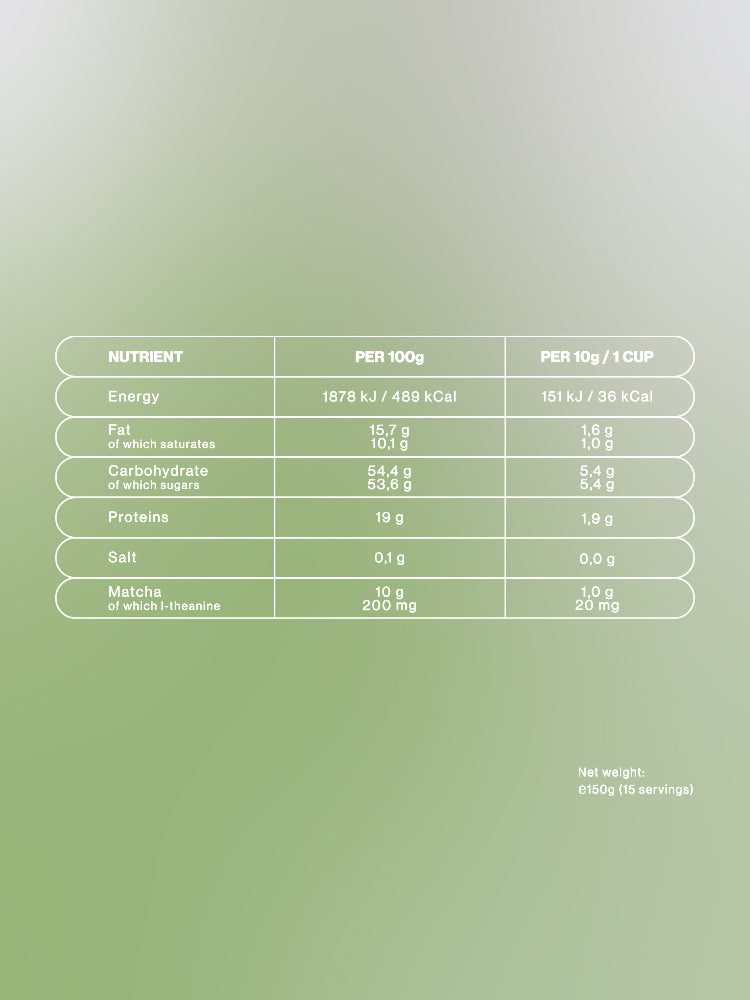 The highest quality ceremonial matcha tea, whole milk powder that gives it the perfect creamy texture, and a delicate vanilla aroma.